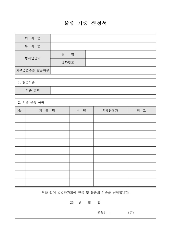 바자회를 개최하는데 있어 기업이 현금 또는 물품의 기증을 신청하는 내용의 물품 기증 신청서 양식입니다. 기증할 현금의 금액 및 물품의 목록을 기재할 수 있습니다.