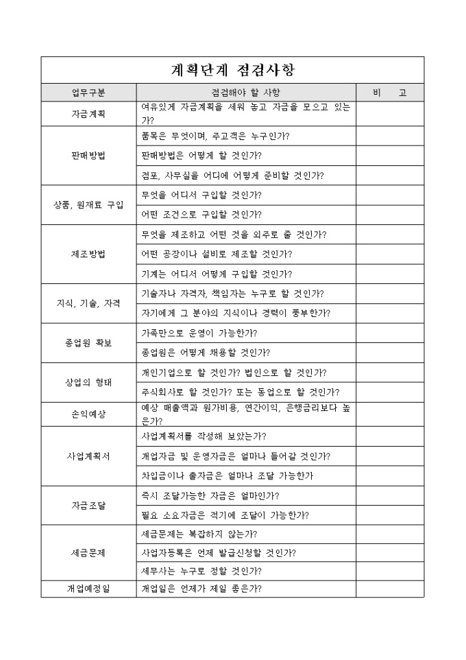 창업의 계획단계에서 점검해야 할 사항등을 기록한 점검표 입니다.
