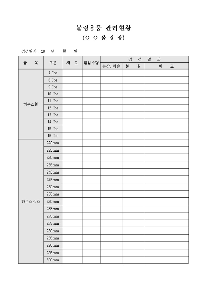 9,000원/월볼링장에서 사용중인 볼링공 및 볼링신발의 관리상태를 점검한 후 그 결과를 기입할 수 있게끔 제작된 서식입니다.