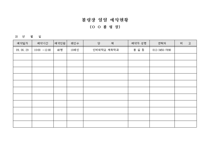 볼링장을 운영함에 있어서 일일 예약사항을 효율적으로 정리하여 예약고객에게 충분한 레인 확보 등을 제공할 수 있도록 제작된 서식입니다.