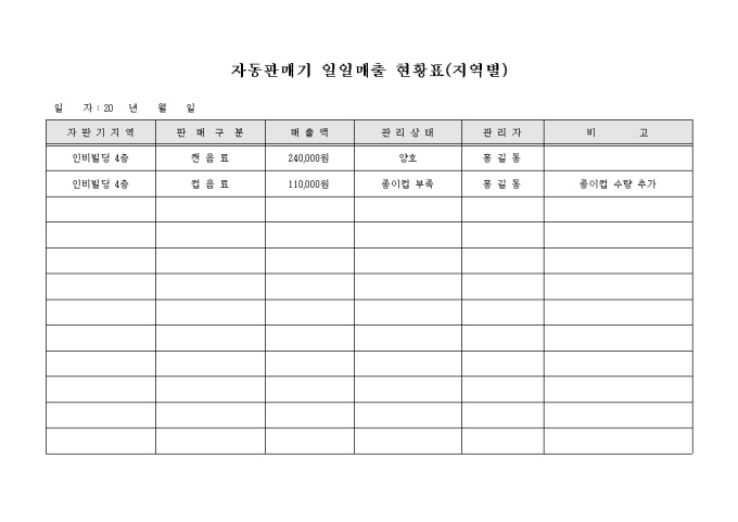 지역별 자동판매기의 일일매출 현황을 효율적으로 관리할 수 있도록 만들어졌으며 관리자 점검 후 이상유무도 확인할 수 있게끔 제작된 서식입니다.