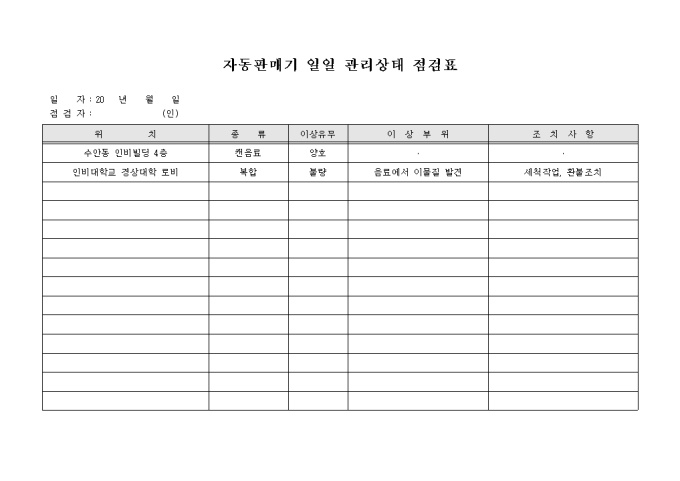 자동판매기의 관리상태를 일자별로 점검한 후 이상유무에 따른 조치사항을 기입할 수 있게끔 제작된 서식입니다.