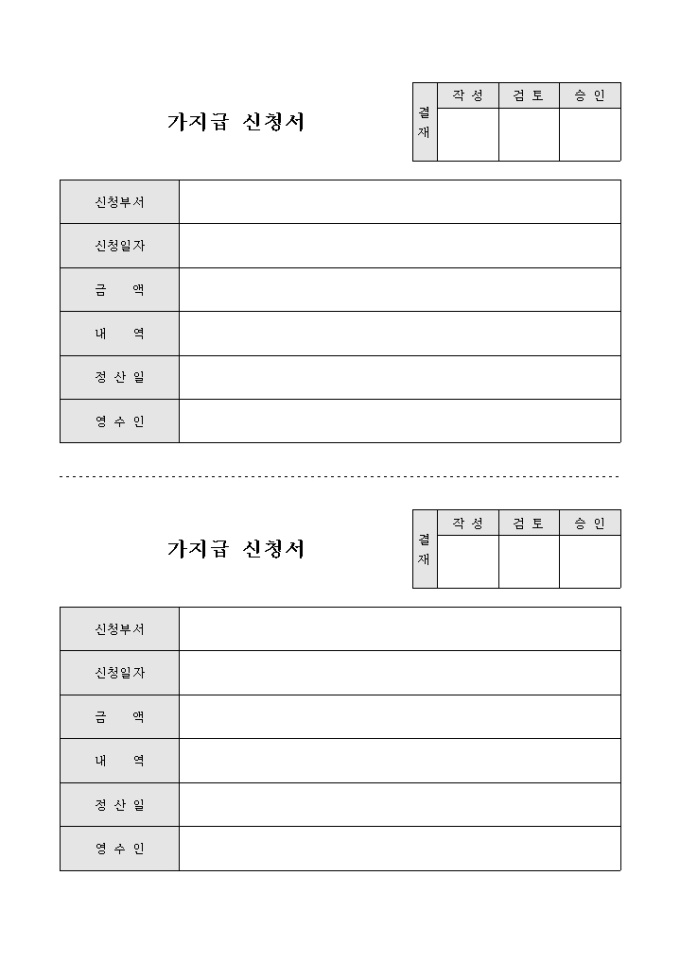 9,000원/월원 지급일보다 앞당겨 임시로 지급하는 돈´을 뜻하는 가지급금을 신청하는 내용의 가지급신청서 양식입니다. 신청부서 및 신청일자, 금액, 내역, 정산일, 영수인 등의 항목을 기재할 수 있으며 2부로 구성되어 있습니다.