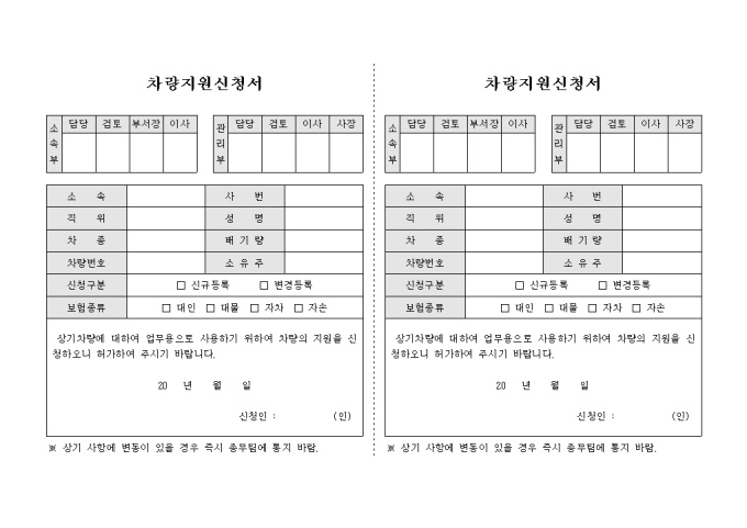 9,000원/월회사의 차량에 대하여 정비를 실시하고자 허가를 구하는 내용의 차량정비 품의서 양식으로 차량번호 및 운전자, 정비내역, 예상비용을 기재할 수 있으며 2부로 구성되어 있습니다.
