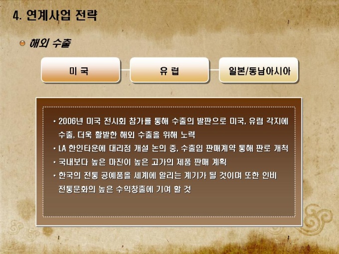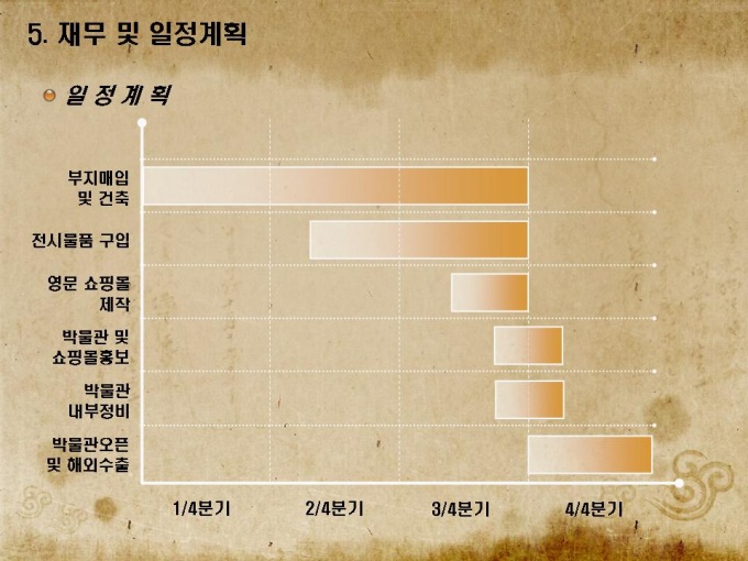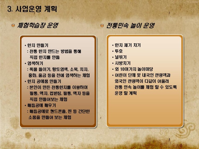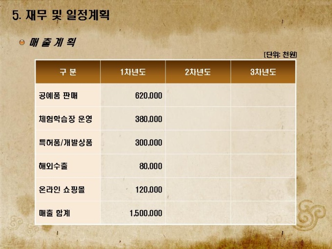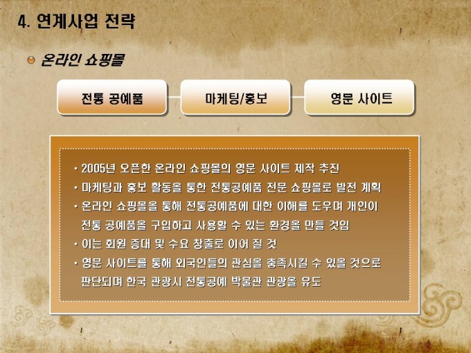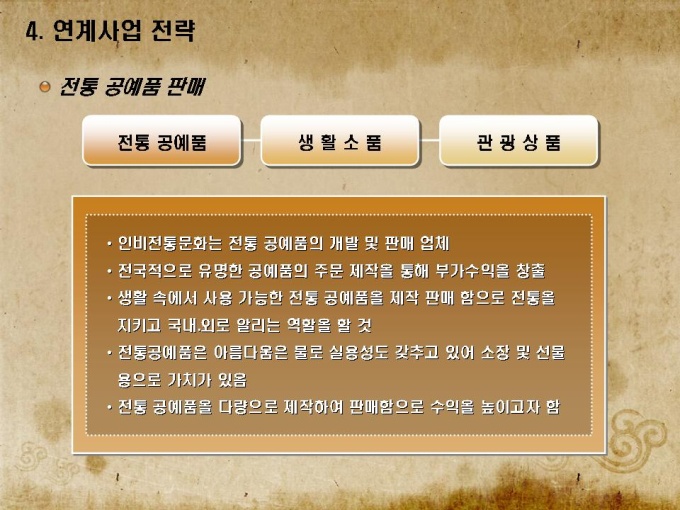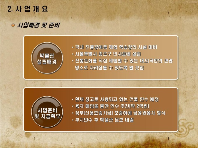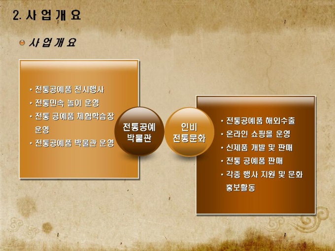 전통공예품 박물관 사업계획서로 목차는 1.회사소개 2.사업개요 3.사업운영 계획 4.연계사업 전략 5.재무 및 일정으로 구성되어있습니다.