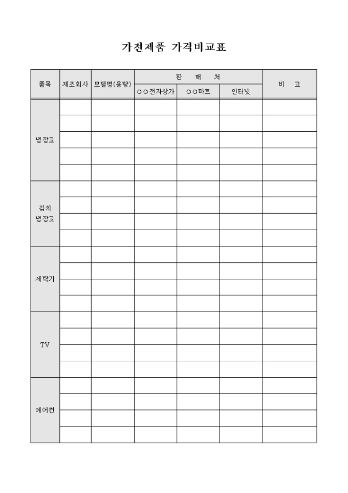 가정에서 가전제품을 구입하고자 할 때 품목별로 제조회사 및 판매처별 가격을 비교하기 위해 작성하는 가전제품 가격비교표 양식입니다.