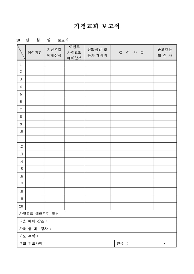 9,000원/월주변사람들과 돌아가며 가정에서 예배를 드리는 가정교회에 대하여 보고하기 위해 작성하는 가정교회 보고서 양식입니다. 참석자명과 지난주 및 이번주 예배참석, 전화심방 및 문자메세지, 결석사유, 예배장소, 교회 건의 사항 등의 항목에 대하여 작성할 수 있습니다.