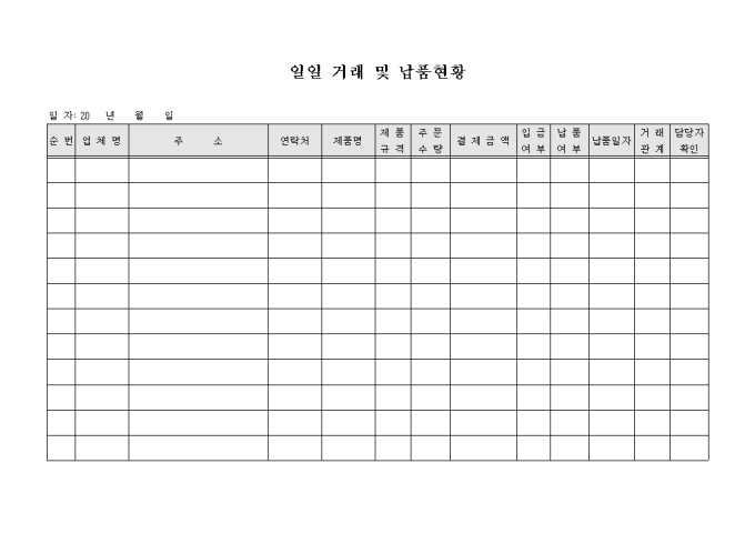 9,000원/월판매하는 제품에 대하여 주문들어온 내역과 납품 여부를 기록할 수 있는 거래 및 납품현황 양식입니다. 거래하는 업체명 및 주소, 연락처, 제품명, 규격, 주문수량, 금액, 납품 여부 등의 항목을 기재할 수 있습니다.
