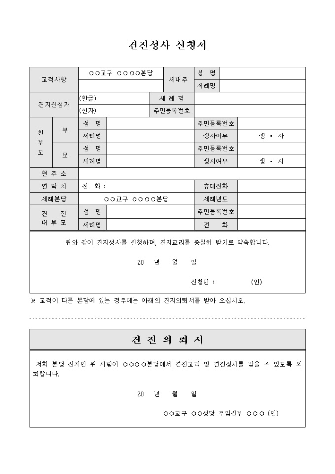 9,000원/월성당에서의 견진성사를 신청하는 내용의 견진성사 신청서 양식입니다. 교적사항 및 신청자의 성명, 주소, 연락처와 친부모 및 견진 대부모의 성명, 세례명 등의 내용을 기재하여 견진성사를 신청할 수 있으며, 교적이 다른 본당일 경우의 견진의뢰서도 포함되어 있습니다.