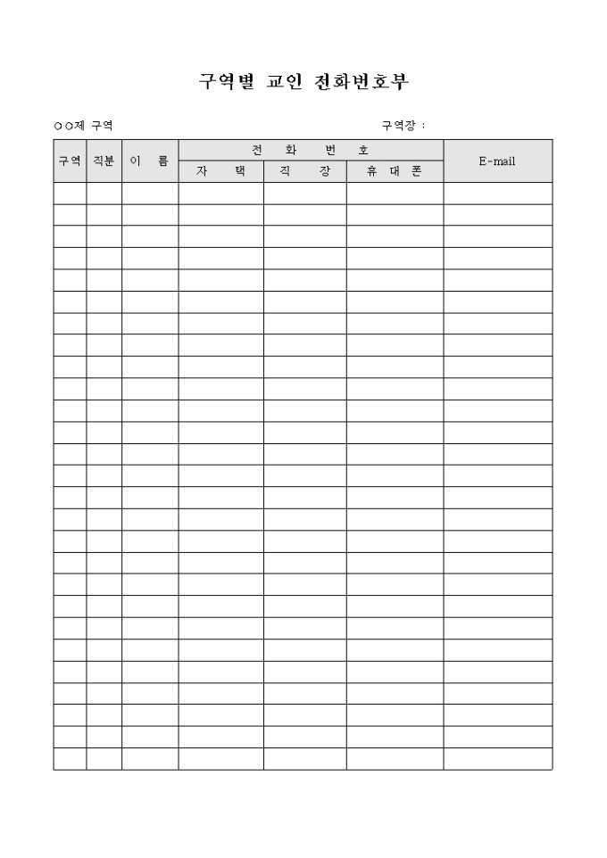 구역별 교인의 전화번호를 기록 할 수있는 서식으로 구역과 직분, 이름, 전화번호 등의 내용을 기록합니다.