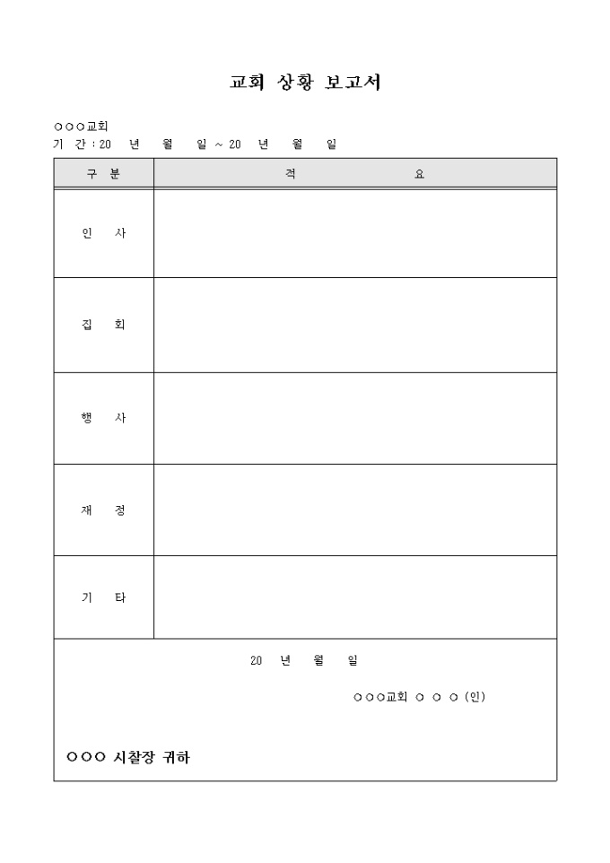9,000원/월해당 기간 동안 교회의 인사, 집회, 행사, 재정 부분에 대한 상황을 서술작성하여 보고하는 형식의 교회 상황 보고서 양식입니다.