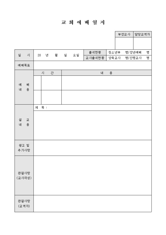 교회에서의 일일 예배 내용을 기록하기 위해 작성하는 예배일지 양식입니다. 예배의 출석현황 및 예배목표, 예배내용, 설교내용, 관찰사항 등의 항목을 기재할 수 있습니다.