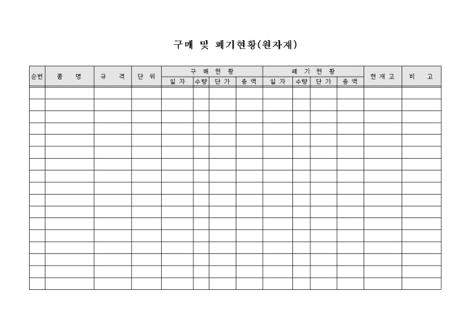 각종 원자재와 관련하여 사내에서 구입 및 폐기 현황을 정리하고자 할 때 사용할 수 있도록 제작된 서식입니다.