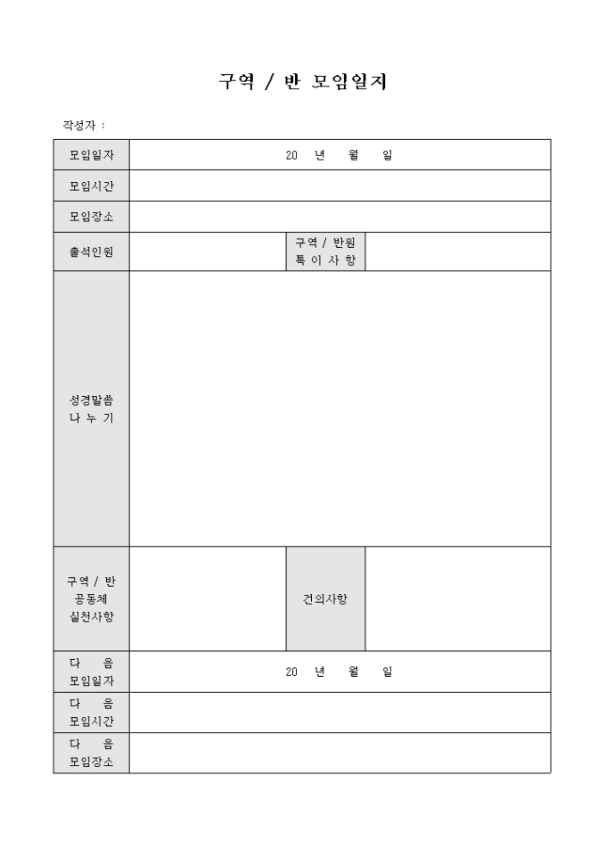 9,000원/월교회에서 현재 활동하고 있는 구역 혹은 반이 모여서 활동한 결과를 일지 형식으로 기록할 수 있도록 만들어졌으며 금번 모임 실시사항 및 차후 모임 계획 등을 기입할 수 있게끔 제작된 서식입니다.