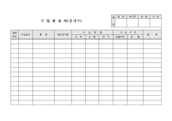 각종 공기구를 구입한 후 그에 대한 내역을 정리하고자 할 때 사용할 수 있도록 만들어졌으며 구입일자, 구입금액 등을 기재할 수 있게끔 제작된 서식입니다.