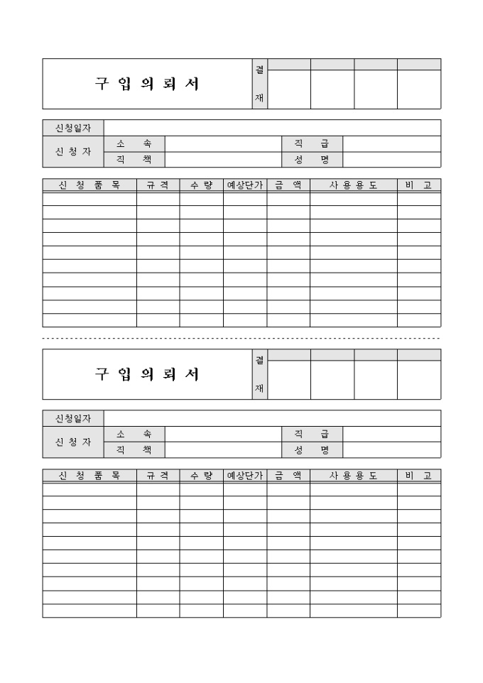 회사에서 사용하고 있는 기기, 물품 등의 구매를 희망하여 이를 회사측에 신청하고자 할 때 사용할 수 있도록 만들어졌으며 2등분으로 구성된 서식입니다.