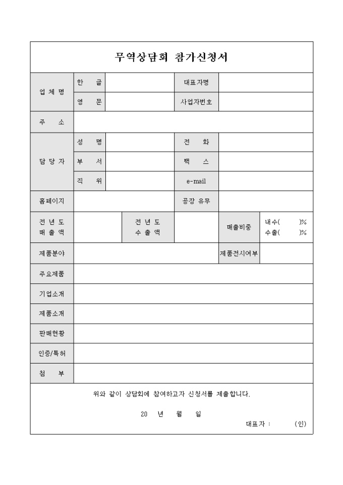 무역상담회에 참가하기 위해 기업의 제품과 기업소개등을 기록하여 사용하는 신청서 입니다.