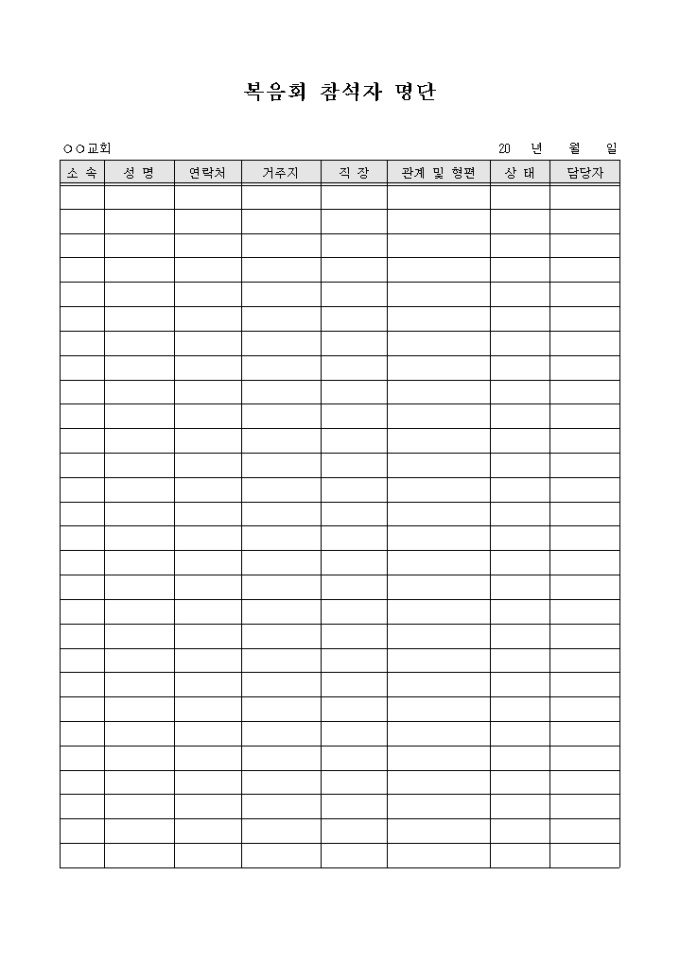 교회의 복음회에 참석한 인원들의 명단을 기록할 수 있도록 구성된 복음회 참석자 명단 양식입니다. 소속, 성명, 연락처, 거주지, 직장, 관계및 형편, 상태 등의 항목으로 구성되어 있습니다.