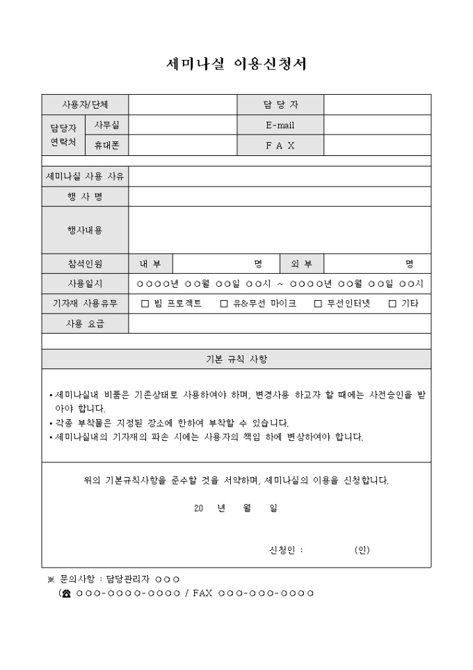 9,000원/월회사의 세미나실을 이용하기 위해 작성하는 세미나실 이용신청서 양식입니다. 세미나실의 사용 사유와 행사명, 행사내용, 참석인원, 사용일시, 기자재 사용유무 등의 항목을 기재할 수 있습니다.