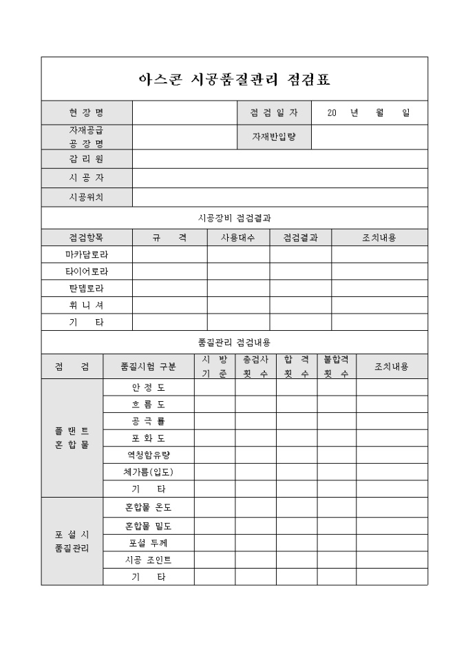 9,000원/월아스콘의 시공품질 관리시 사용되는 시공품질의 점검내용과 점검결과등을 확인 할 수 있도록 구성된 점검표 입니다.