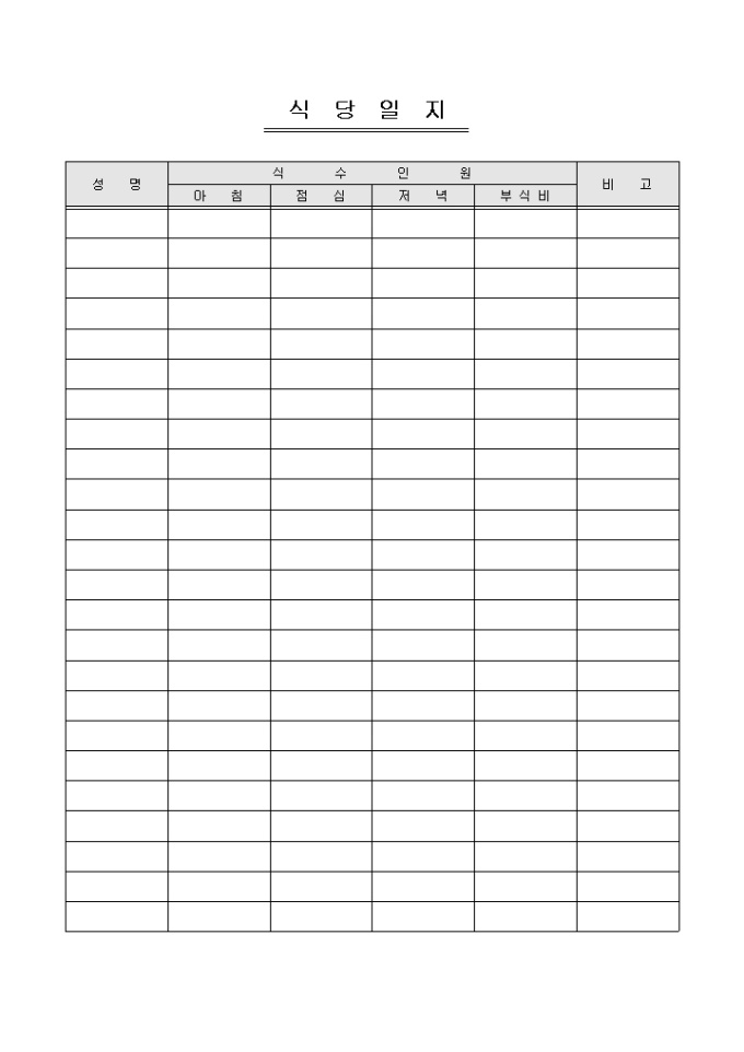9,000원/월식당에서 음식을 먹은 사람을 하루하루 기록 할 수 있도록 제작된 서식으로 이름과 식수인원 등을 시간대별로 기록합니다.