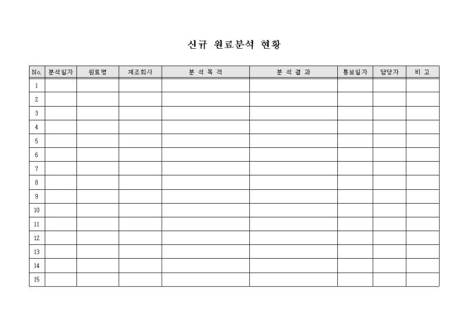 제품을 제조하는데 필요한 원료중 신규로 들여온 원료에 대하여 분석하고 그 현황을 기록하는 현황표 양식입니다. 원료명, 제조회사, 분석목적, 분석결과 등의 사항을 기재할 수 있습니다.