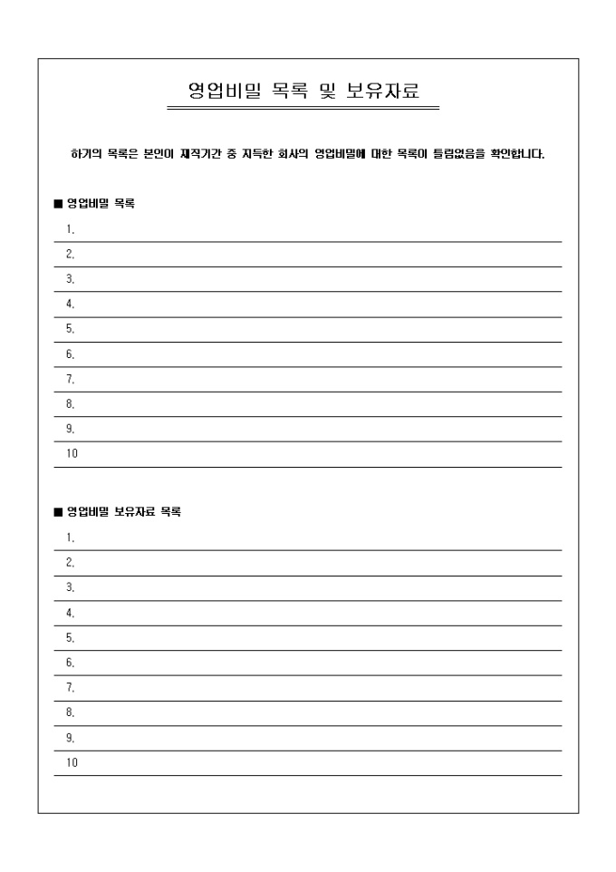 9,000원/월사내에서 자신이 영업과 관련하여 취득한 정보 및 비밀자료 등의 목록을 상부에 보고하고자 할 때 사용할 수 있도록 제작된 서식입니다.
