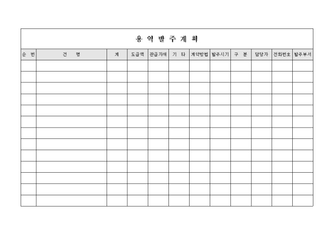 제품의 제조 및 공사현장 등에 소요되는 용역대한 발주내용을 작성하기 위한 용역발주계획 양식입니다.