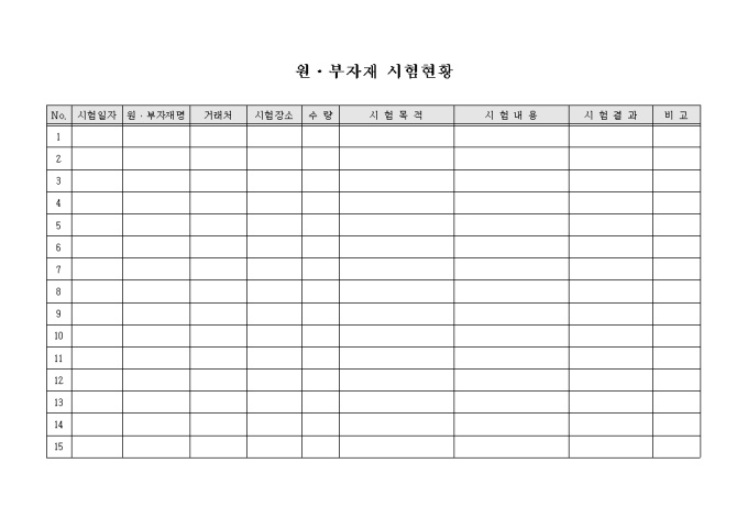 제품의 제조공정에 소요되는 원자재 및 부자재에 대하여 제품의 제조에 적합한가를 시험하고 그 현황을 기록하기 위한 원·부자재 시험현황표 양식입니다. 시험일자와 원·부자재명, 시험장소, 수량, 시험목적, 시험내용, 시험결과 등의 사항을 기재할 수 있습니다.