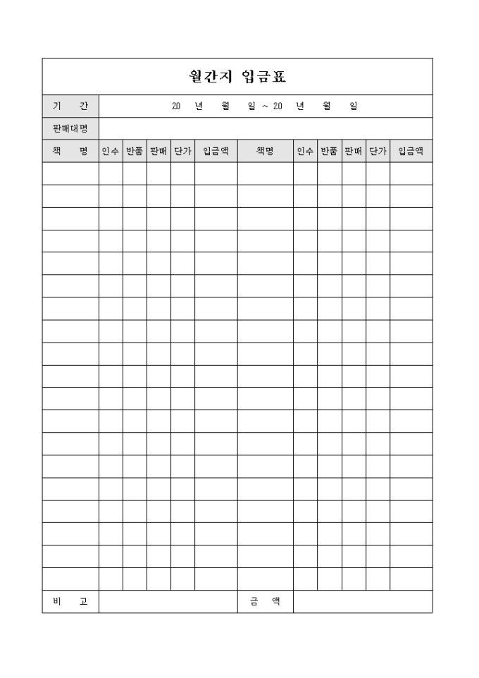 9,000원/월월간의 판매 현황과 반품 현황 및 입금액 등을 확인 할 수 있는 월간지 입금표 입니다.