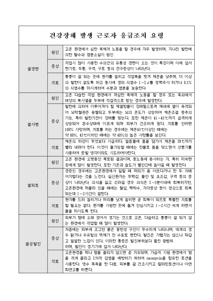 9,000원/월업무 수행중 건강장해가 발생한 근로자에 대한 응급조치 요령법 등을 기록한 응급조치 요령 양식입니다. 열경련, 열사병, 열피로 등의 장애대한 원인, 증상, 치료 내용 등이 기재되어 있습니다.