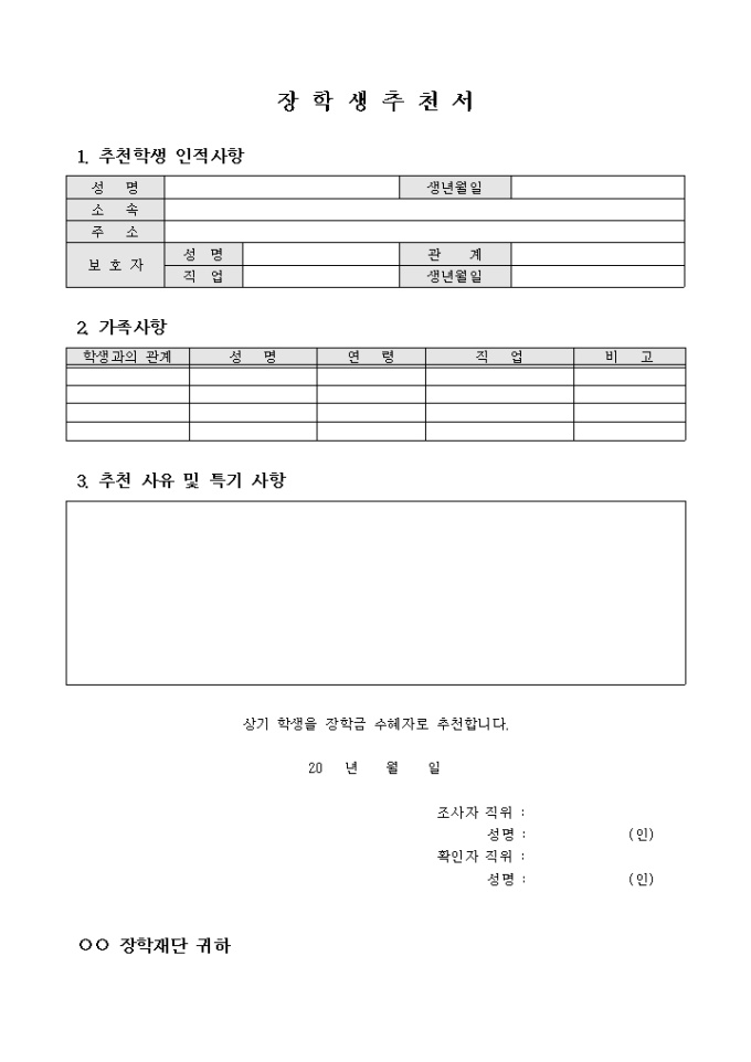 9,000원/월장학재단에 학교 소속 학생을 장학생으로 추천하고자 할 때 사용할 수 있도록 만들어졌으며 학생 인적사항, 가족사항을 기입하고 추천사유를 서술형태로 작성할 수 있게끔 제작된 서식입니다.