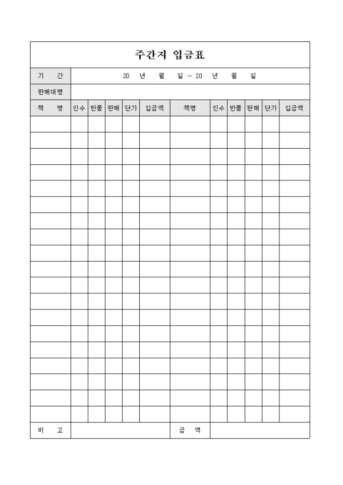 9,000원/월주간지의 판매 현황과 반품 현황 및 입금액 등을 확인 할 수 있는 주간지 입금표 입니다.