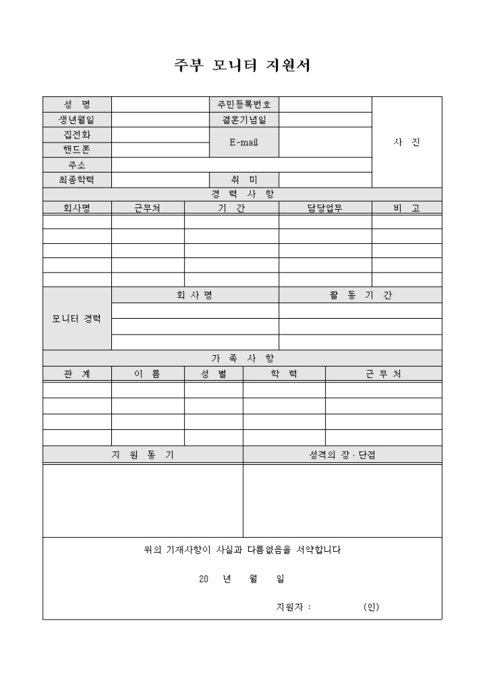 9,000원/월기업에서 실시하는 주부모니터제도에 지원하기 위해 작성하는 주부모니터 지원서 양식입니다. 지원자의 기본사항과 지원동기, 성격의 장·단점 등의 내용을 기재할 수 있습니다.