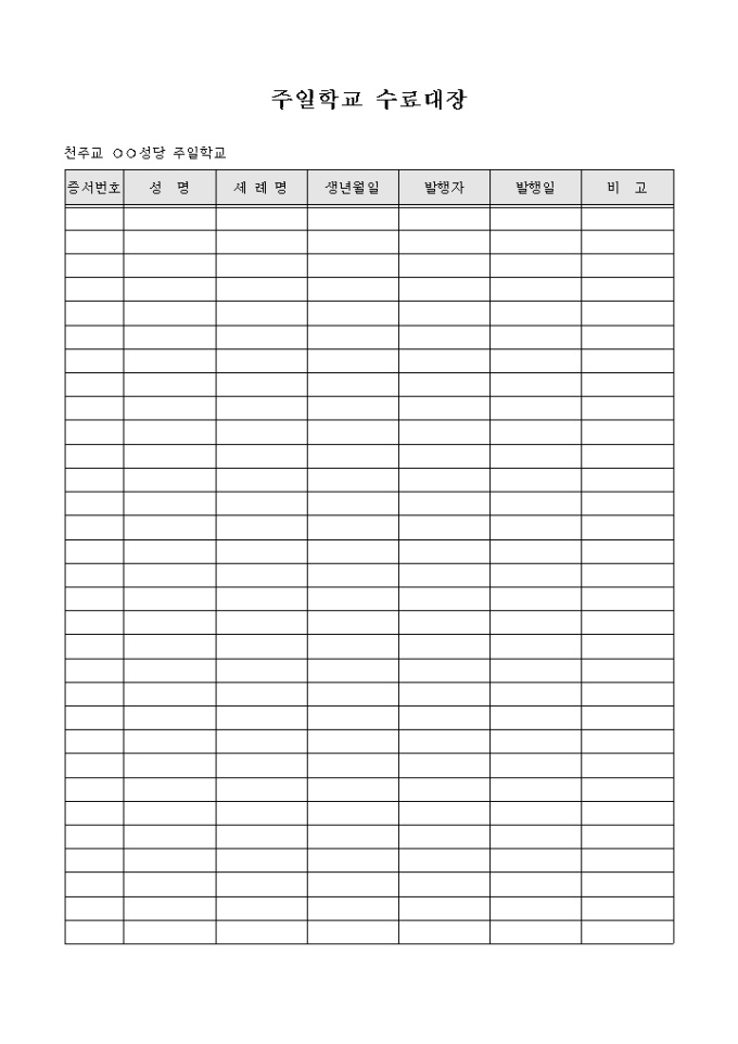 성당에서 진행한 주일학교에서 수료한 인원들의 목록을 기재하는 양식의 주일학교 수료대장입니다. 수료한 인원의 성명, 세례명, 생년월일, 발행자, 발행일 등의 항목을 기재할 수 있습니다.