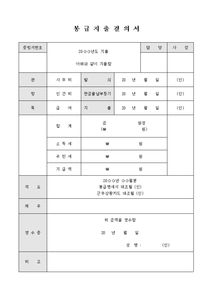 9,000원/월지출결의서로 관, 항, 목과 발의, 지출 날짜, 지출금 등을 기록하고 대조필 하여 영수증합니다.