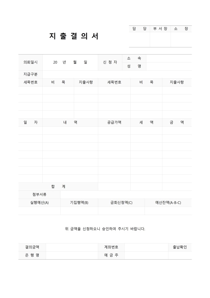 지출 항목별 지출사항등을 기록 할 수 있도록 구성된 지출 결의서 입니다.