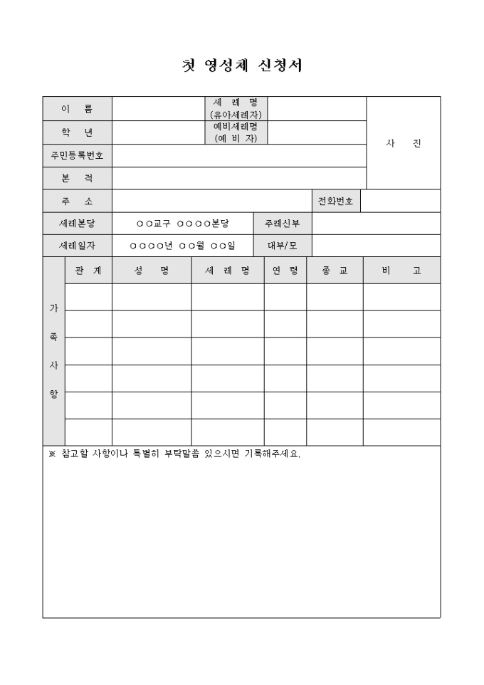 성당에서 첫 영성체를 받고자 할 때 작성하는 첫 영성체 신청서 양식입니다. 영성체를 받고자 하는 인원의 인적사항과 세례본당, 세례일자, 가족사항, 참고사항 등의 항목을 작성할 수 있습니다.