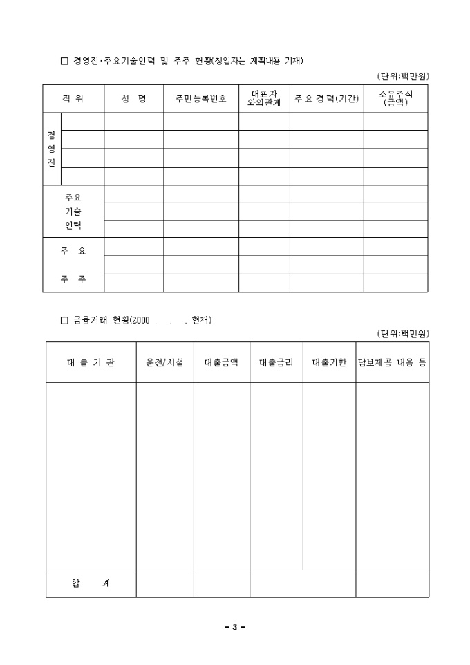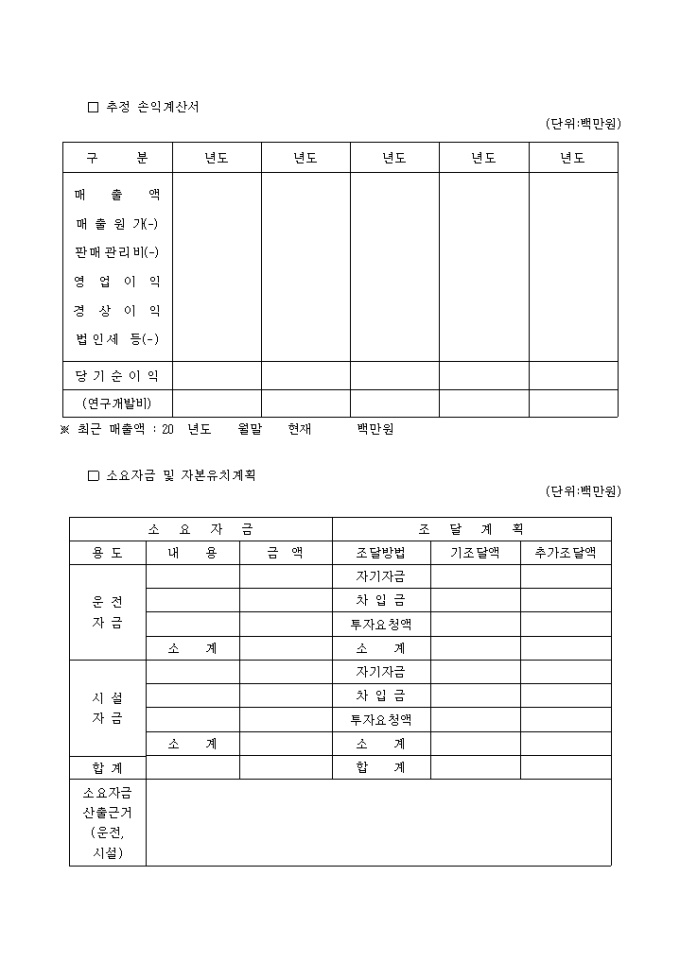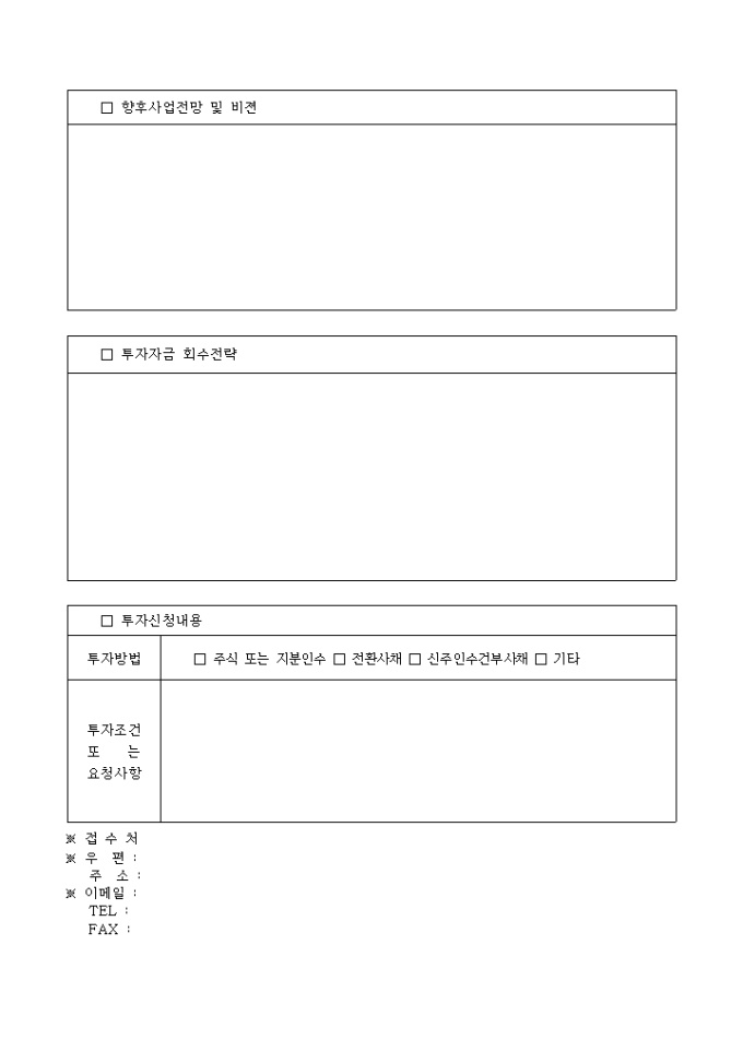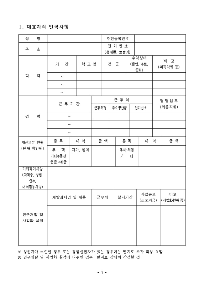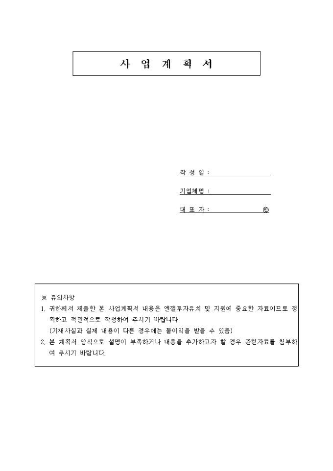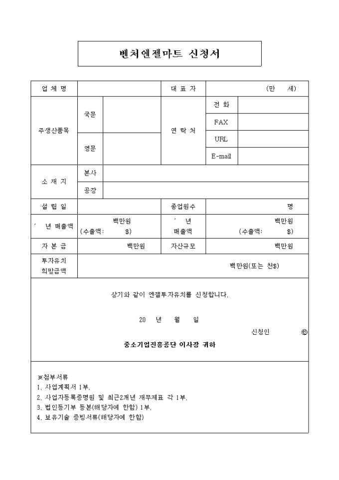 9,000원/월벤처엔젤마트신청서 양식입니다. ※첨부서류 1. 사업계획서 1부. 2. 사업자등록증명원 및 최근2개년 재무제표 각 1부. 3. 법인등기부 등본(해당자에 한함) 1부. 4. 보유기술 증빙서류(해당자에 한함)