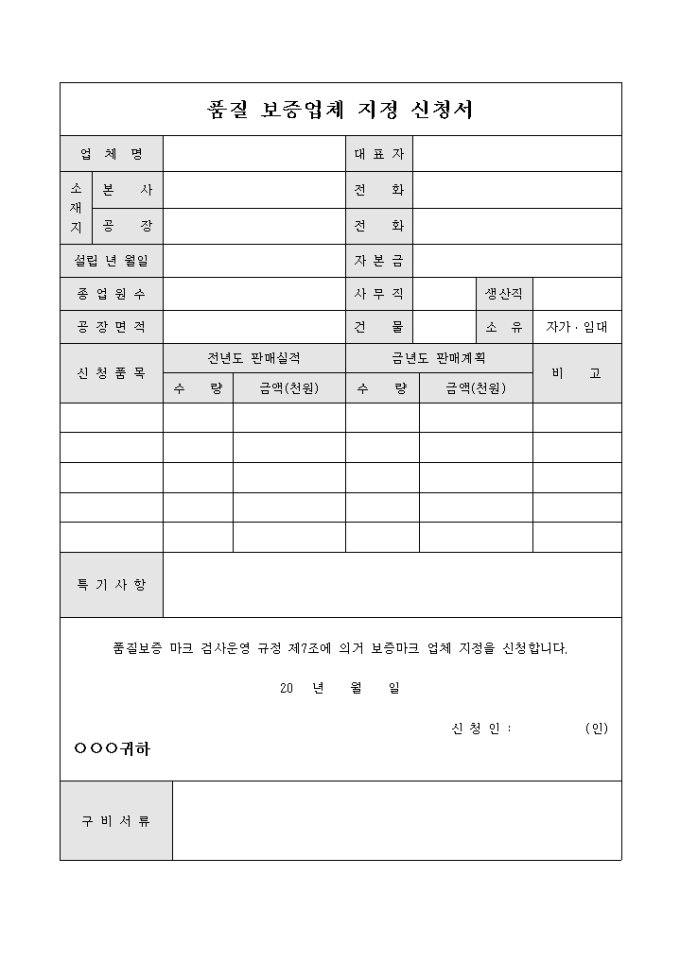 품질보증 마크 검사 운영에 의거 보증마크 업체 지정을 신청시 사용되는 지정 신청서 입니다.