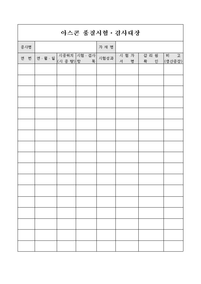 9,000원/월아스콘의 품질 심험 및 검사내용 및 결과등을 기록 할 수 있도록 구성된 품질시험 검사대장 입니다.