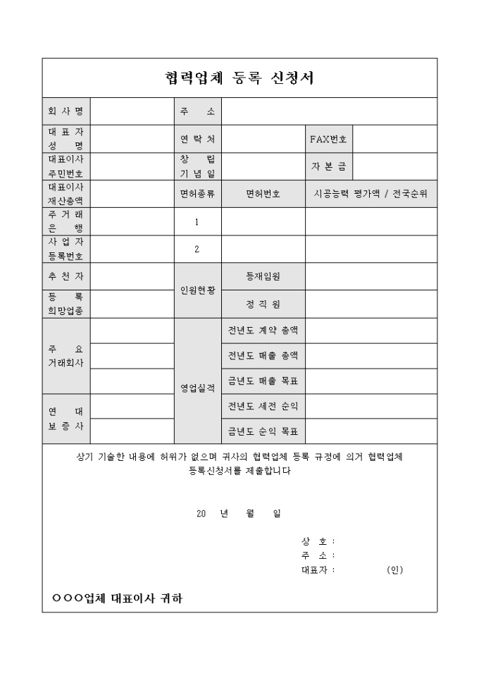 9,000원/월협력업체 등록 신청서 입니다. 영업 실적 및 회사의 정보를 기록하여 협력 업체 등록을 하고자 할때 사용하는 신청서 입니다.