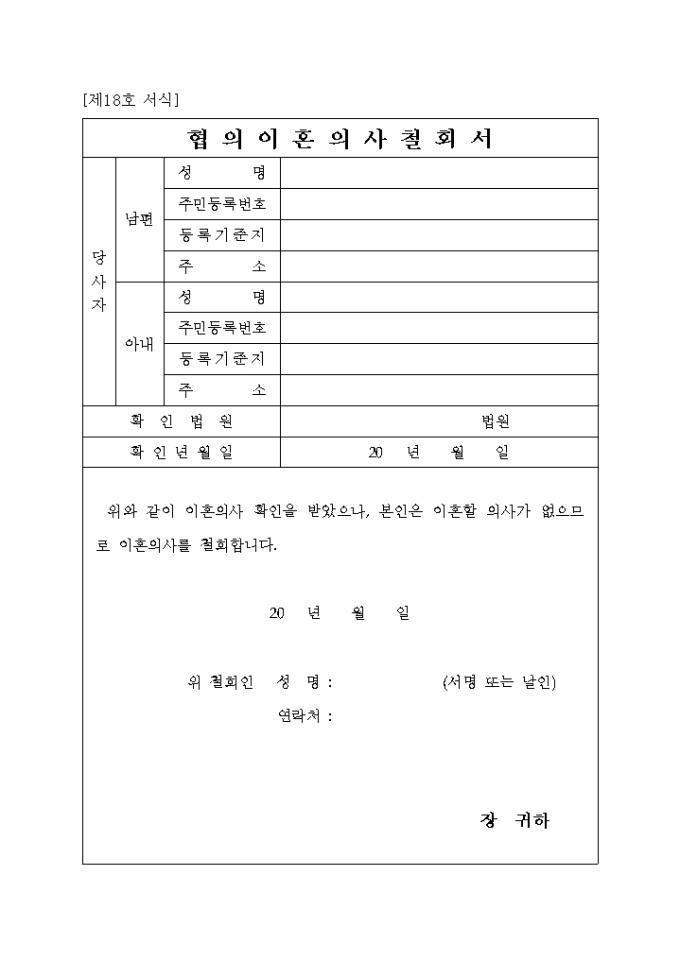 이혼의사 확인을 받았으나, 이혼할 의사가 없으므로 이혼의사를 철회할 때 사용하는 2009년 4월 14일 개정된 협의이혼의사철회서입니다.
