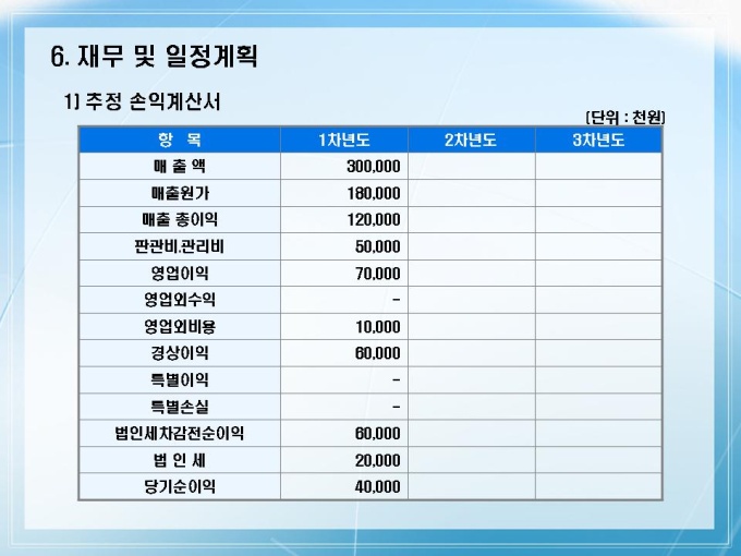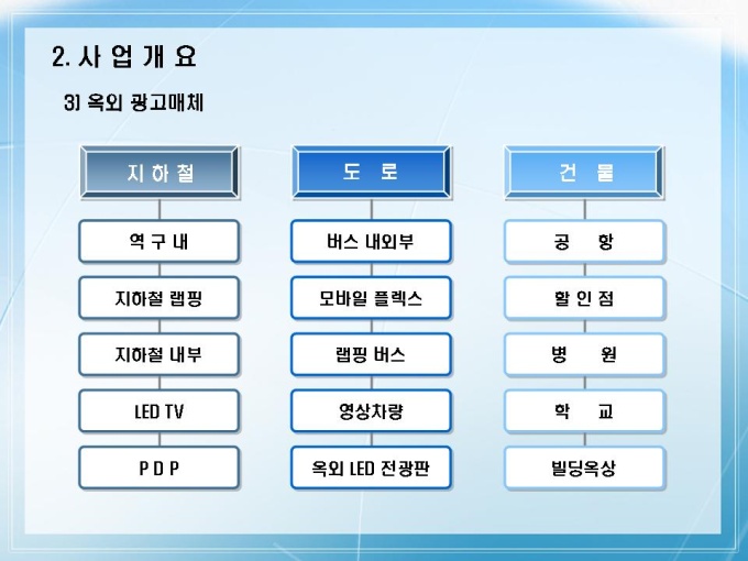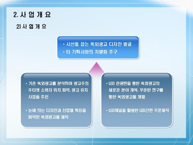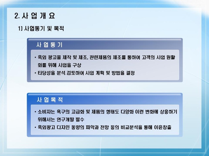 옥외광고물 제작 회사의 사업계획서입니다. 목차는 1.회사소개 2.사업개요 3.시장분석 4.사업계획 5.사업전략 6.재무 및 일정계획으로 구성되어있습니다.