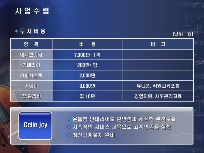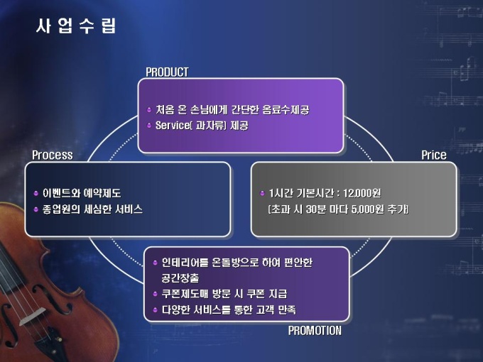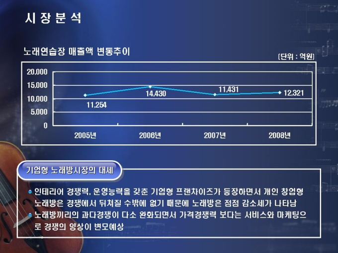 체인화된 노래연습장 사업계획서입니다. 목차는 1.회사개요 2. 시장분석 3.사업수립 4.재무계획으로 구성되어 있습니다.