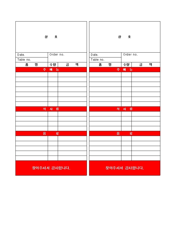 9,000원/월주문 받을 때 사용하는 빌지 양식으로 상호와 주소, 전화번호 등을 기재할 수 있고, 테이블번호, 품명, 수량 등을 기록합니다.