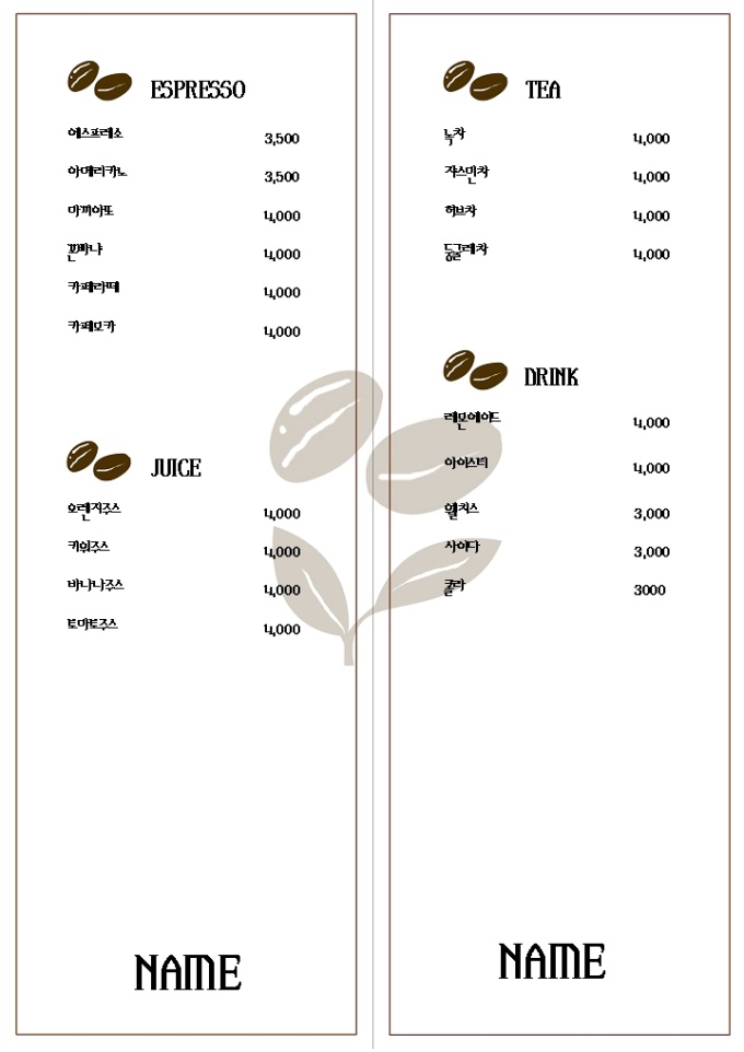 카페에서 사용하는 메뉴판으로 A4사이즈로 프린트하여 코팅 후 사용하시면 깔끔하게 사용할 수 있고 안에 내용은 환경에 맞게 변경하여 사용가능합니다.