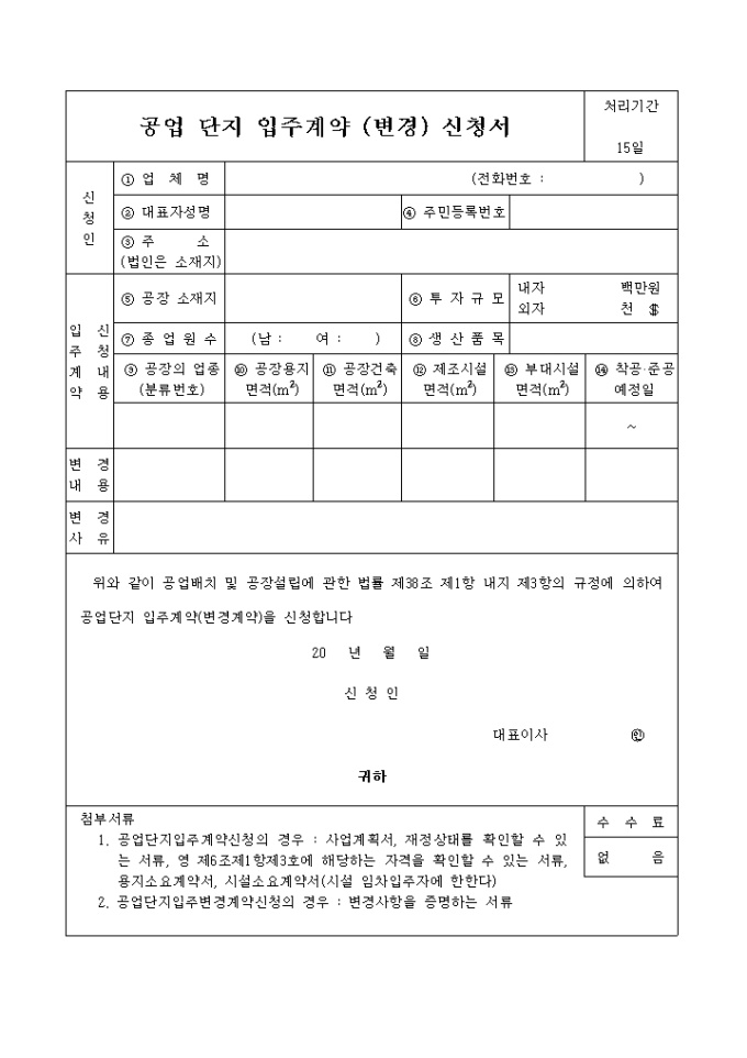 공업배치 및 공장설립에 관한 법률 제38조 제1항 내지 제3항의 규정에 의하여 공업단지 입주계약(변경계약)을 신청할 때 사용하는 양식입니다.
