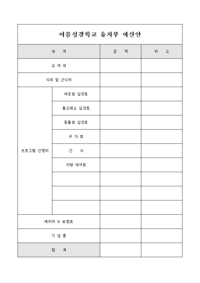 여름방학동안 교회에서 실시하는 유치부 여름성경학교의 예산안 입니다. 금액별 내역을 확인 할 수 있도록 구성되어 있습니다.