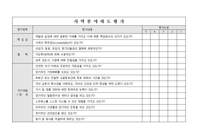 해외 사역시 평가 항목별 내용등을 확인하여 협력 및 책임감에 대한 평가하고자 할 때 사용하는 평가지 입니다.